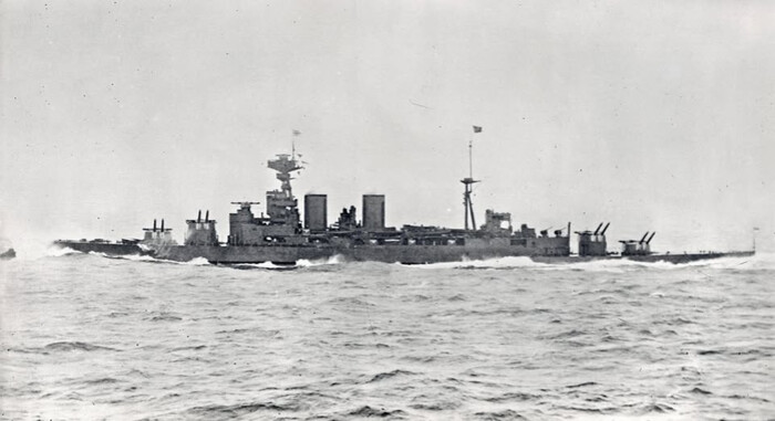 Малоцитируемое фото гордости и флагмана Royal Navy - линейного крейсера HMS Hood, на ходу, с мокрым носом и задранными стволами ГК